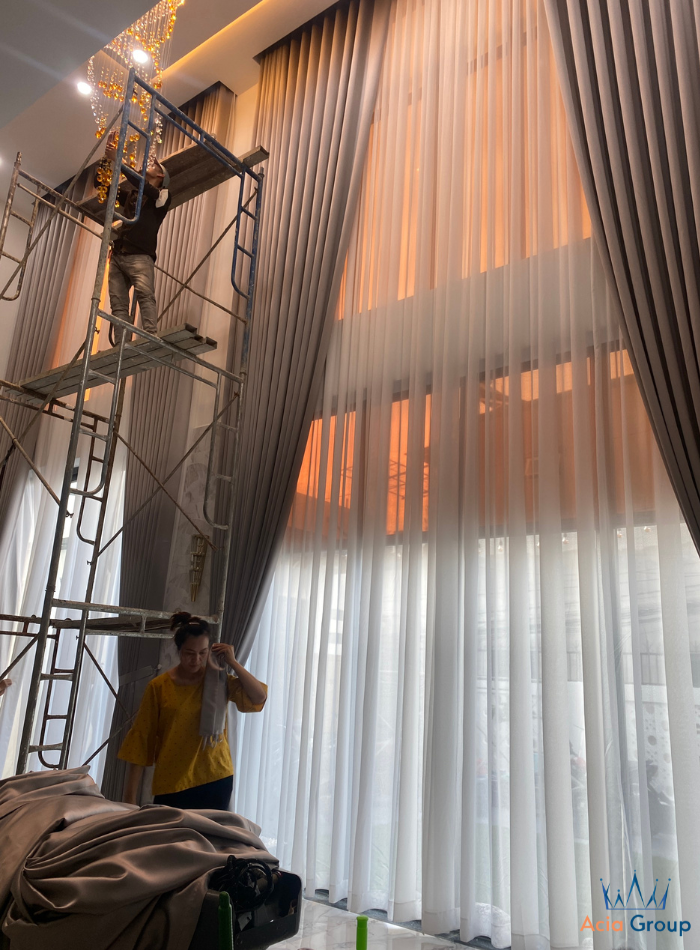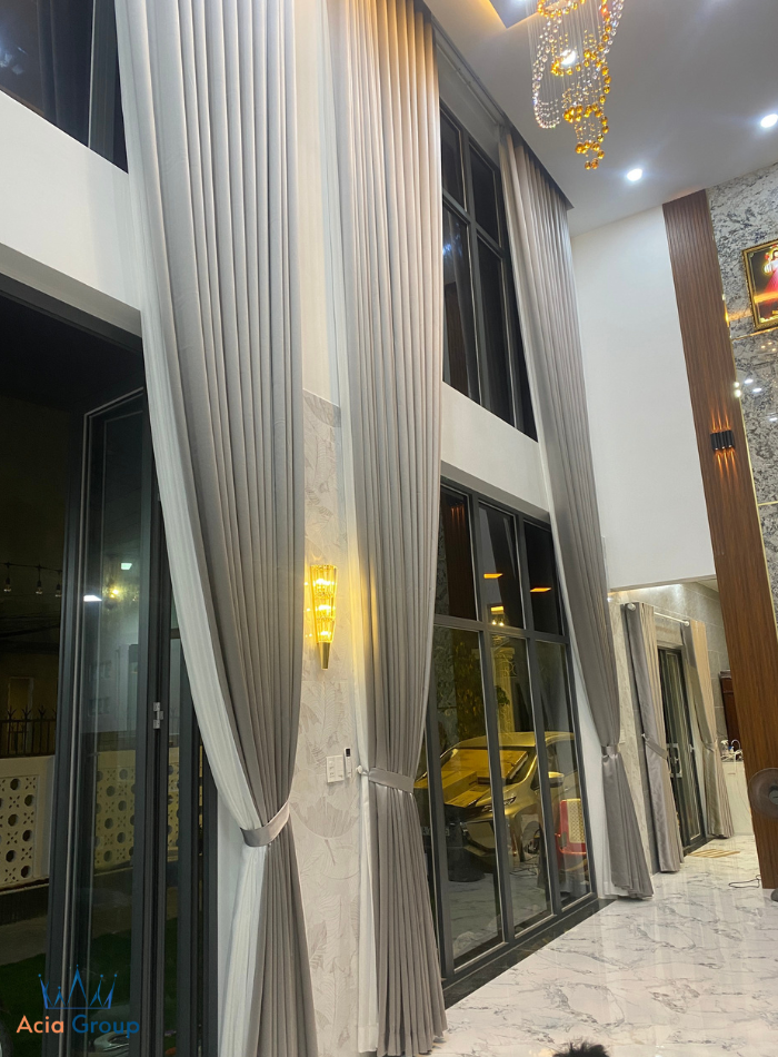 Bộ rèm phòng khách là rèm thông tầng 2 lớp, vải chống nắng 90%, bộ rèm có chiều cao 7,5 mét